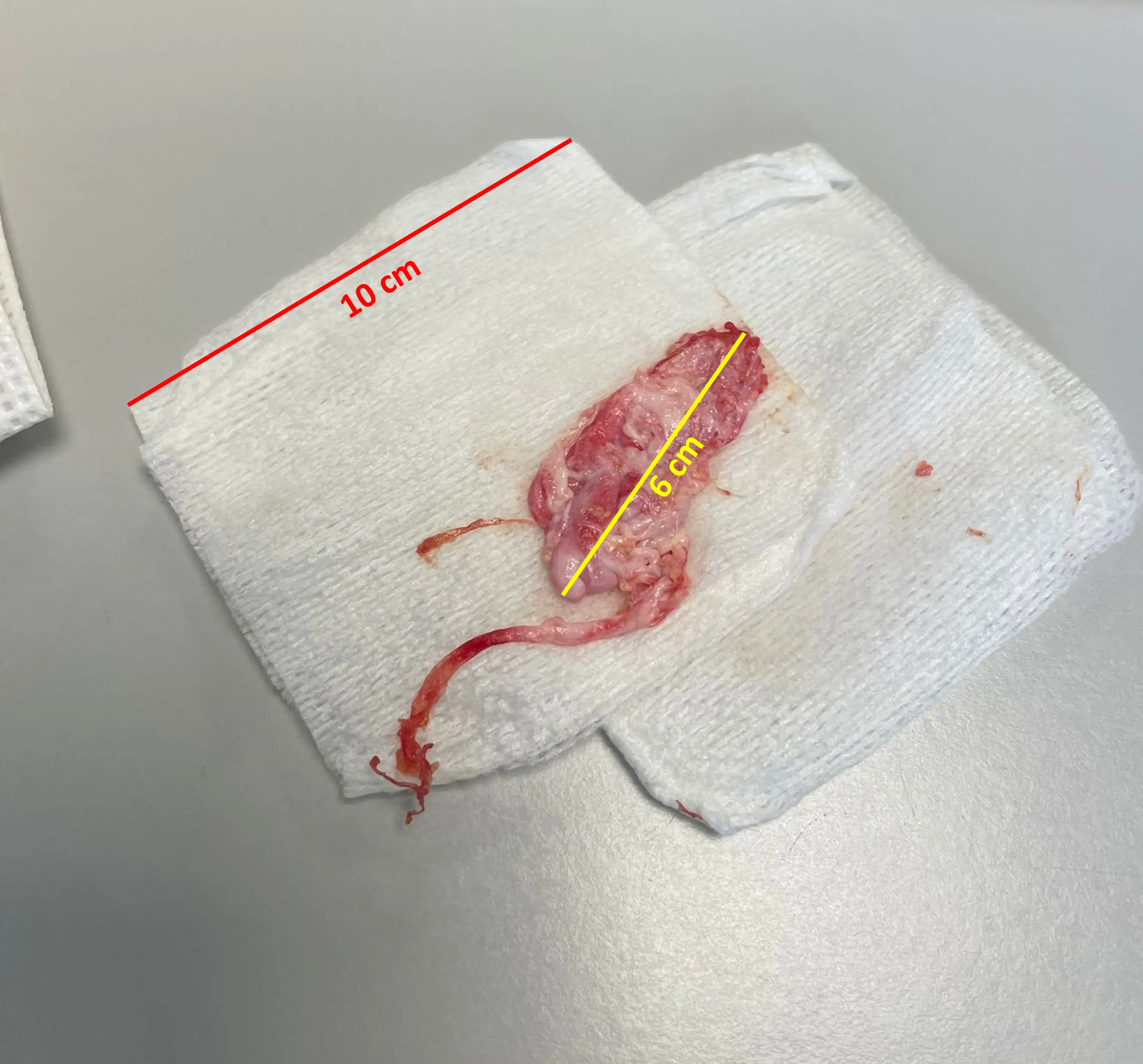 Case presentation summary: A 12-year-old boy, with a prenatal diagnosis of aortic coarctation surgically corrected on the 4th day of life, presented to the emergency department following an episode of oxygen desaturation (SpO2 80–85%) triggered by coughing and the expectoration of a mucofibrinous, branched structure measuring approximately 6 cm, which his mother brought with her (Figure 1). The patient reported a one-week history of productive cough, without fever or other systemic symptoms, and occasional respiratory effort. On examination, he was eupnoeic, with SpO2 of 99% on room air. Pulmonary auscultation revealed reduced breath sounds at the left lung base and occasional wheezing. Chest radiography showed opacification of the lower half of the left hemithorax, with marked delineation of the bronchial tree suggestive of fibrinous casts. During observation, the patient remained clinically stable, presenting productive cough, but did not expectorate additional casts. Peripheral oxygen saturation remained adequate on room air, and urgent bronchoscopy was therefore considered unnecessary. He was discharged home with mucolytic therapy and arranged for urgent follow-up in the Paediatric Pulmonology clinic.